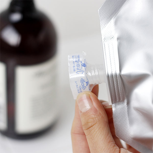 詰め替えた後は小さく丸めて捨てられる、パウチタイプのパッケージ。