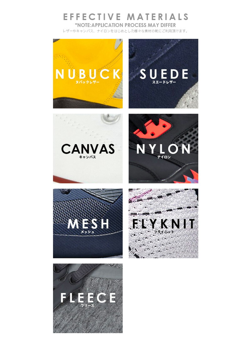 ココナッツエキス、水、ホホバオイルをはじめとする98%の天然成分から構成されるクリーニング液は、天然皮革や合成皮革はもちろん、スエード、ヌバック、キャンバス、ナイロンなどの幅広い素材に対応。